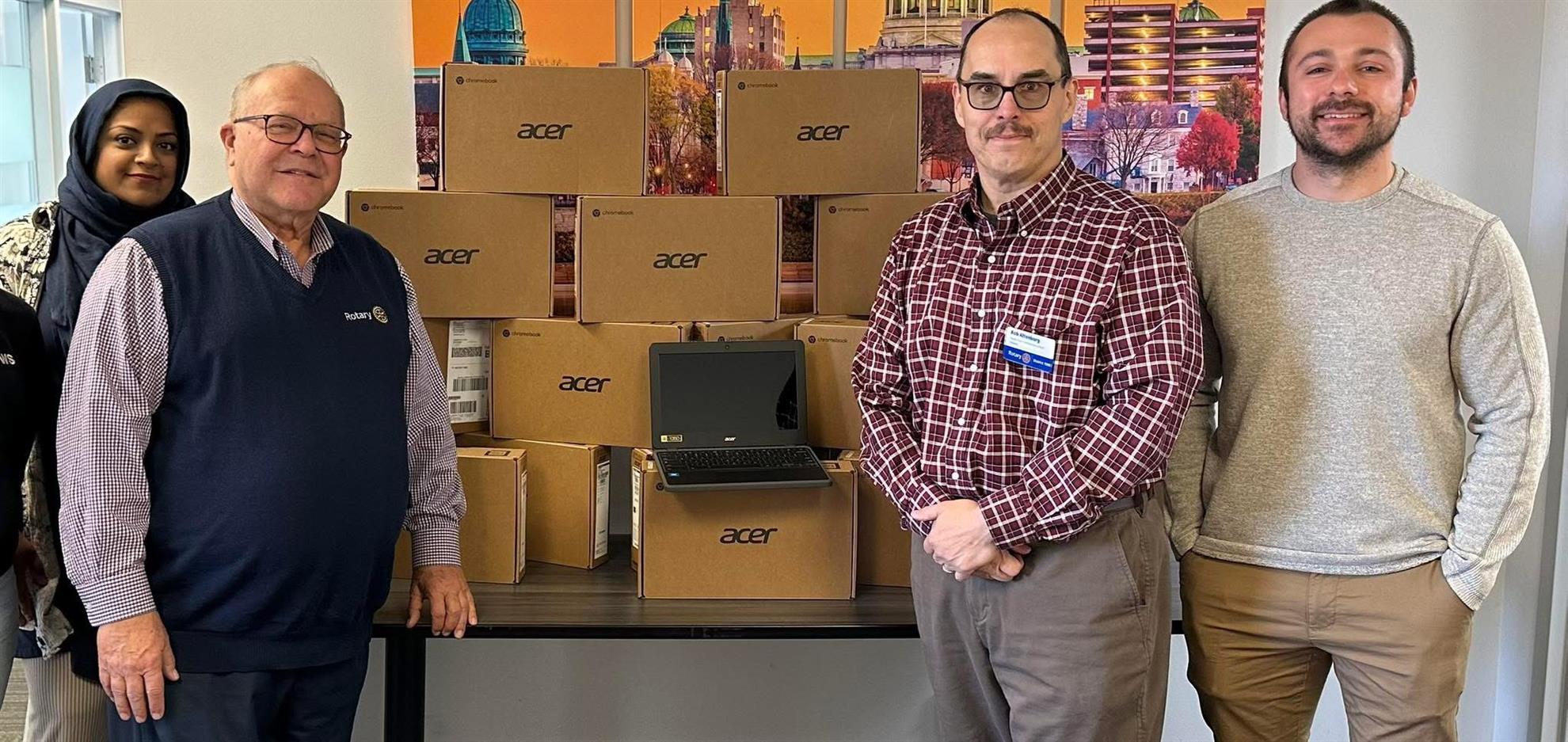 Our club participated in a 2025-2026 District Club Grant project that enabled us to purchase 18 laptop computers for refugee families supported by Church World Services of Harrisburg. Our grant was for a total of $5000 with half coming from our club and the other half from District Designated Funds. Pictured from left to right, Duri Sharif (CWS Associate Director of Recruitment and Engagement), John Robinson (Club Board Member and CWS Harrisburg Board Member), Rob Altenburg (Club President), and Alex Swan (CWS Harrisburg Site Director). Special thanks to Elk Systems Incorporated for selling these laptops to us at cost which helped us make the most of our grant!